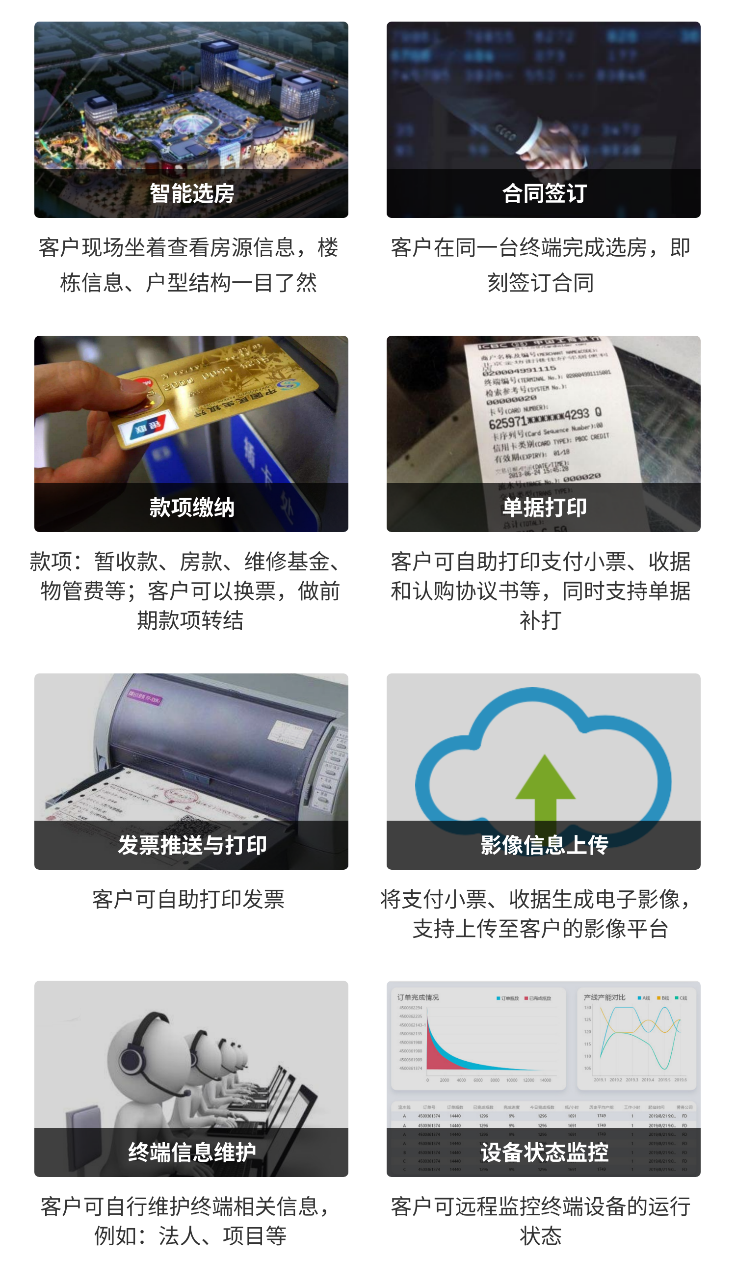 證通智慧地產(chǎn)解決方案系統(tǒng)是公司為房地產(chǎn)開(kāi)發(fā)商客戶定制的一款售樓處收款賬務(wù)一體化的綜合解決方案。系統(tǒng)通過(guò)與地產(chǎn)公司內(nèi)部0A系統(tǒng)、財(cái)務(wù)系統(tǒng)、房管局系統(tǒng)稅務(wù)系統(tǒng)等多個(gè)地產(chǎn)公司內(nèi)外部系統(tǒng)進(jìn)行對(duì)接,集成刷臉支付、微信、支付寶、銀行卡等多種支付渠道,支持客戶使用人臉識(shí)別、身份證、指紋進(jìn)行身份確認(rèn),提供選房合同簽訂、繳款、單據(jù)查詢打印、記賬、退費(fèi)、影像信息上傳、設(shè)備狀態(tài)監(jiān)控、終端管理、數(shù)據(jù)統(tǒng)計(jì)和報(bào)表推送等的全流程買賣房服務(wù),讓數(shù)據(jù)多跑路,讓客戶少跑路,實(shí)現(xiàn)房費(fèi)輕松繳、客戶零等待、開(kāi)心買賣房!