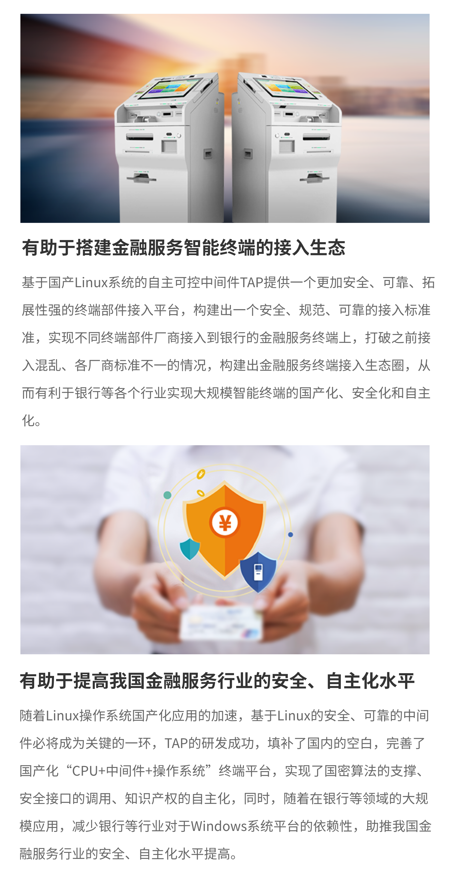 證通自主研發(fā)的面向金融領(lǐng)域的自主可控金融中間件平臺(tái),是基于Linux下的XFS服務(wù)中間件一TAP,通過(guò)構(gòu)建統(tǒng)一金融終端中間件平臺(tái),實(shí)現(xiàn)接口的統(tǒng)一,從而讓金融機(jī)構(gòu)更便捷的接入不同廠家不同型號(hào)的部件,同時(shí),通過(guò)對(duì)國(guó)密等算法的支持,構(gòu)建安全加密服務(wù),保障信息存儲(chǔ)、傳輸?shù)陌踩裕瑥亩WC金融終端的穩(wěn)定性、功能連續(xù)性、兼容性、靈活性、安全性,助力國(guó)產(chǎn)金融系統(tǒng)的安全、自主、可控。