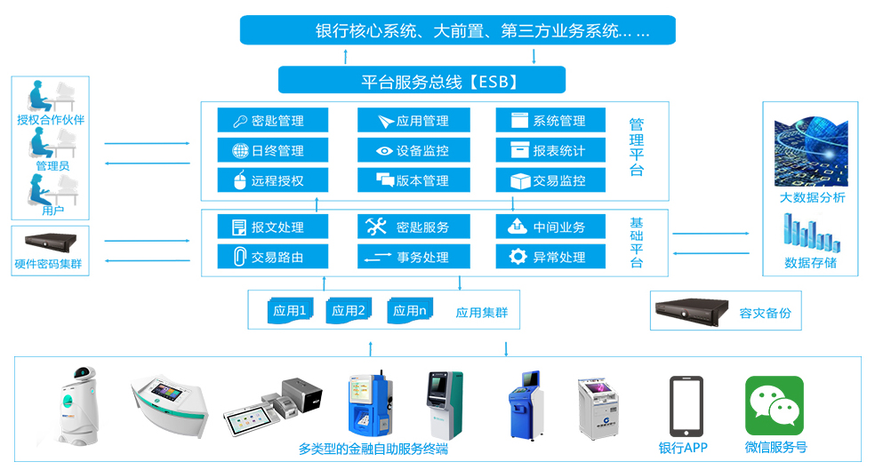 TSP平臺打通了銀行核心系統(tǒng)、第三方業(yè)務系統(tǒng)、微信,支持不同類型自 助終端的部署與多種業(yè)務的集成,同時還具備終端的遠程運維管理、交易 監(jiān)控、消息分發(fā)(微信、短信、郵件、APP)、報表統(tǒng)計、應用管理等功 能,為客戶提供全方位的增值化服務。