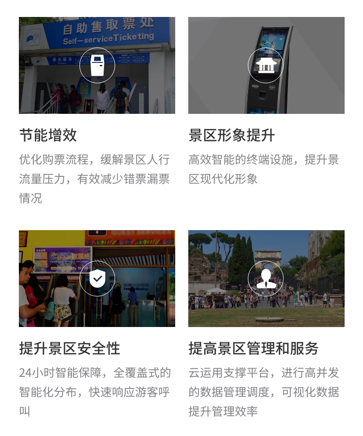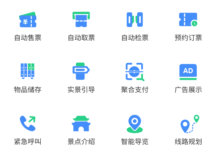 滿足景區(qū)自助售票、取票、檢票等基本需求,可提供充電寶租借、無線WIFI等信息化服務(wù);終端可支持銀行卡、現(xiàn)金、微信、支付寶等多種支付方式;終端配置、功能均可選擇,外觀可定制。