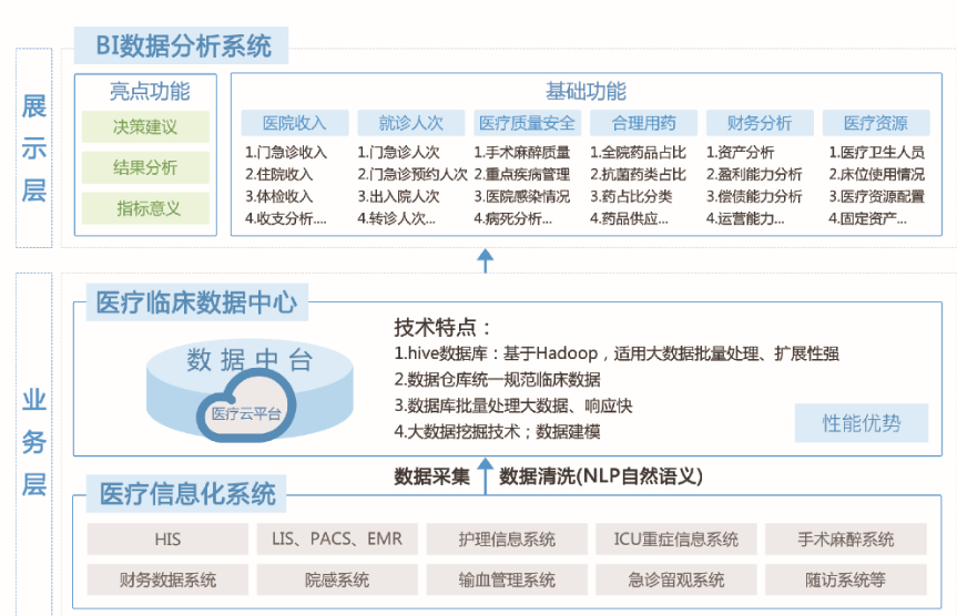 由于醫(yī)院現(xiàn)有業(yè)務系統(tǒng)的數(shù)據(jù)無法統(tǒng)一整合與分析,并無法為醫(yī)院領導及各級管理者提供經(jīng)營管理決策的依據(jù)。醫(yī)療大數(shù)據(jù)解決方案致力于利用hadoop大數(shù)據(jù)挖掘、數(shù)據(jù)倉庫和OLAP多維分析等技術,通過門急癥服務、住院服務、用藥管理、手術麻醉、醫(yī)療資源、財務統(tǒng)計等方面功能的接入和完善,整合/分析醫(yī)院業(yè)務信息系統(tǒng)的業(yè)務數(shù)據(jù),建立統(tǒng)一的用于醫(yī)院運營管理與科學研究的可視化指標分析管理體系。