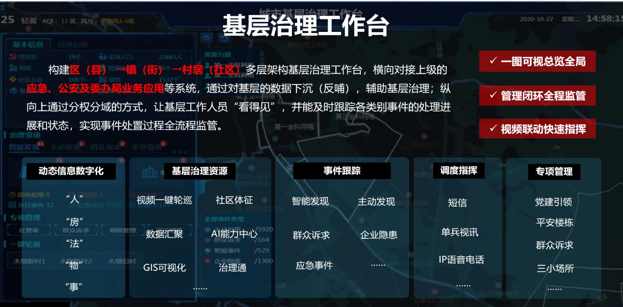 為貫徹習總書記“把更多更好的資源、服務、管理下沉到社區(qū)”的基層治理指導方針,充分利用智慧城市已建基礎設施,通過整合資源、數(shù)據(jù)共享為基層治理管理人員、網(wǎng)格員、平安員等提供日常信息化管理工具。聚焦治安、治理、服務三大領域,通過數(shù)據(jù)下沉、全事件跟蹤、資源力量實時調度等手段,用數(shù)據(jù)把人、制度、服務、管理要求連接起來,真正支撐基層的管理工作,實現(xiàn)精細化治理和精準服務,全面提升社區(qū)的治理與服務現(xiàn)代化水平。