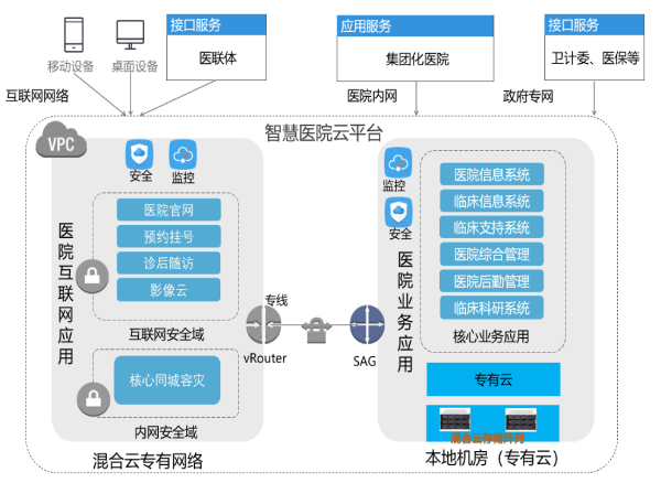 依托當(dāng)?shù)氐?/span>IDC資源,通過建設(shè)公共云和本地專有云組成混合云模式,在保障業(yè)務(wù)安全、信息安全的前提下,支撐互聯(lián)網(wǎng)醫(yī)療應(yīng)用的拓展及數(shù)據(jù)共享,構(gòu)建區(qū)域智慧醫(yī)療混合云平臺(tái)