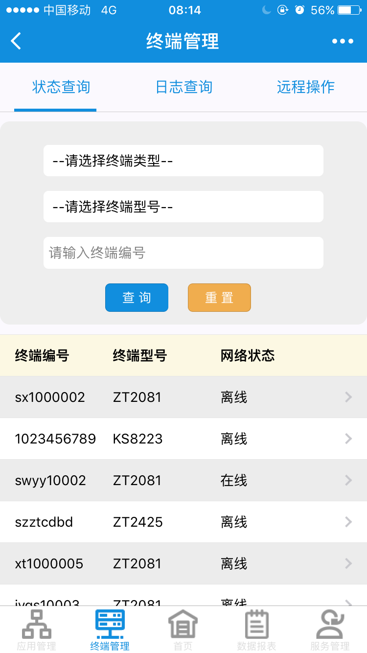 終端管理:可以進(jìn)行終端添加、查詢、遠(yuǎn)程操作,終端日志的查詢等一系列活動(dòng),監(jiān)控所有入網(wǎng)終端設(shè)備的運(yùn)行狀態(tài)和性能變化,隨時(shí)了解各類布放終端的信息和實(shí)時(shí)運(yùn)行狀況,并能遠(yuǎn)程操作控制終端的狀態(tài),及時(shí)查詢并提供終端管理的支持活動(dòng),保障終端設(shè)備平穩(wěn)的運(yùn)行。