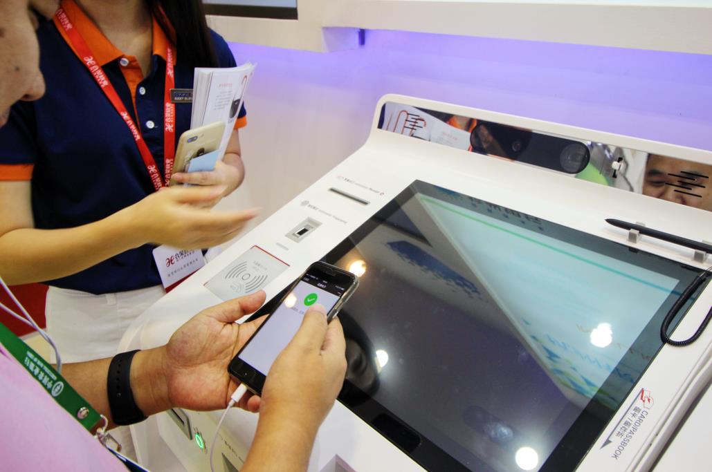 展示區(qū)另外一個(gè)人氣爆款就是位于智慧銀行區(qū)域的“微信存取款”智慧柜員機(jī),這是證通研發(fā)制造的國(guó)內(nèi)首款具有手機(jī)微信賬戶實(shí)時(shí)提現(xiàn)、存款的智慧柜員機(jī),用戶可通過(guò)機(jī)器提取自己微信賬戶中的零錢(qián)。