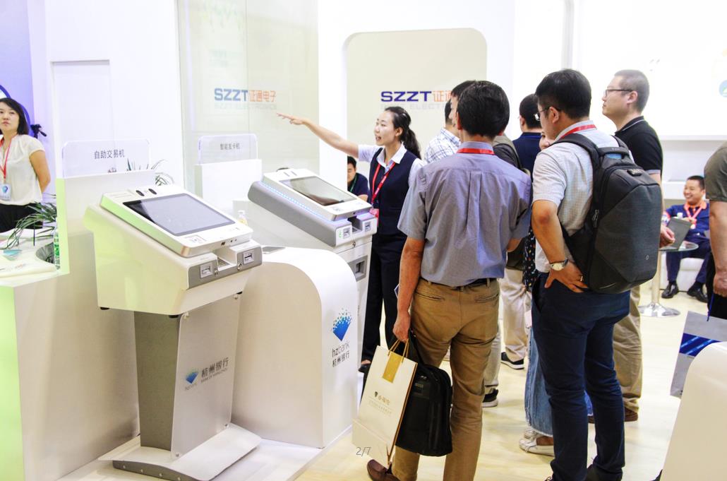 本次展會(huì),證通電子特邀杭州銀行參與展示,并為其設(shè)定了專門(mén)的智慧銀行設(shè)備展示區(qū)域,展會(huì)過(guò)程中,杭州銀行展示區(qū)人流不斷,觀眾們紛紛駐足觀看杭州銀行智慧網(wǎng)點(diǎn)的演示視頻,并饒有興趣地向現(xiàn)場(chǎng)工作人員了解設(shè)備的優(yōu)勢(shì)特點(diǎn)。