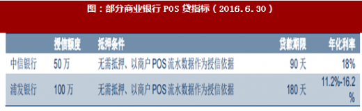 而從POS貸的業(yè)務(wù)特點(diǎn)看,放款效率高,抵押條件低,是對(duì)于缺少抵押產(chǎn)品的小微商戶最方便的融資方式,而從其融資成本看,若參照一般商業(yè)銀行的指導(dǎo)來看,根據(jù)商業(yè)銀行的官網(wǎng)通知來看,其規(guī)范的指引年化利率一般控制在20%以內(nèi)。不過,傳統(tǒng)POS貸由于征信的維度單一,且資金流造假存在不確定性,因此自2016年下半年開始,根據(jù)好貸網(wǎng)等專業(yè)金融資訊網(wǎng)站的統(tǒng)計(jì),銀行對(duì)小微貸趨向謹(jǐn)慎,住房按揭和政府項(xiàng)目是貸款主方向。