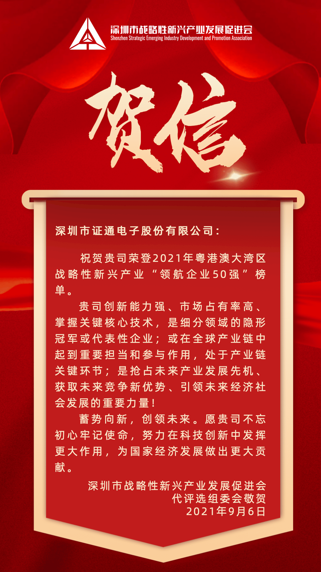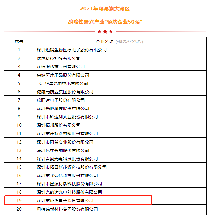 8月31日,由深圳市戰(zhàn)略性新興產(chǎn)業(yè)發(fā)展促進(jìn)會聯(lián)合深圳報業(yè)集團(tuán)·深圳商報等單位開展的2021年粵港澳大灣區(qū)戰(zhàn)略性新興產(chǎn)業(yè)“領(lǐng)航企業(yè)50強”暨首屆戰(zhàn)略性新興產(chǎn)業(yè)“拓荒人物”“青年領(lǐng)袖”評選結(jié)果正式揭曉。本次評選歷時6個月,經(jīng)過了新聞發(fā)布、征集報名、材料初篩和實地考察、評委終審等環(huán)節(jié),最終在400余家企業(yè)中確定了榜單。證通電子、邁瑞醫(yī)療、瑞聲科技、深信服等50家企業(yè)上榜“領(lǐng)航企業(yè)50強”名單。