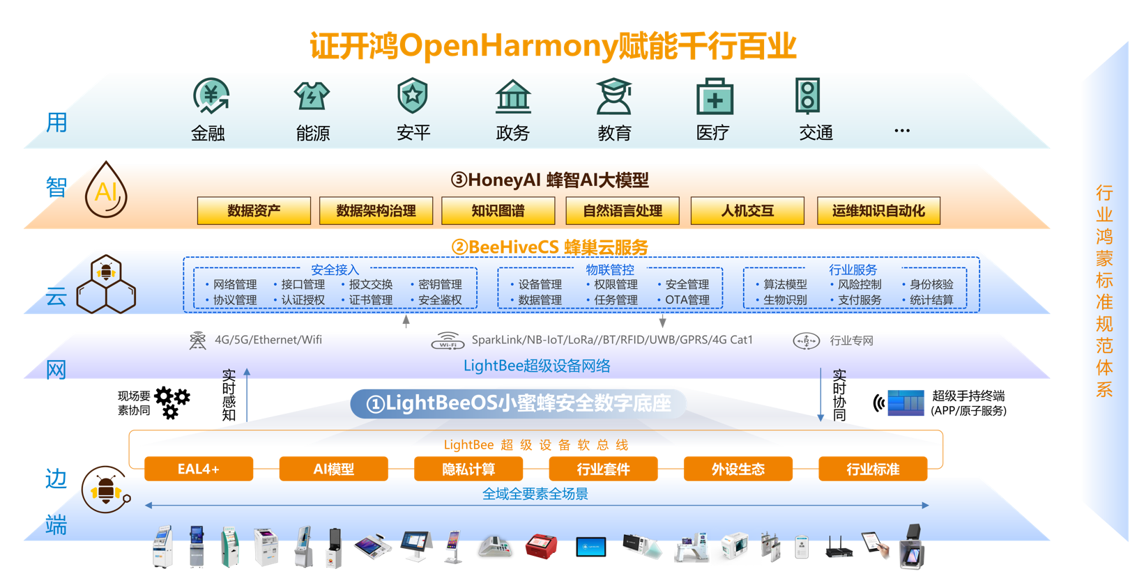證開鴻作為開源鴻蒙生態(tài)的推動者及鴻蒙生態(tài)服務(wù)公司的重要合作伙伴,依托LightBeeOs操作系統(tǒng)\BeeHiveCS蜂巢云服務(wù)\HoneyAI蜂智AI大模型,構(gòu)建一個完整的智能生態(tài)系統(tǒng),為用戶打造“端、邊、云、網(wǎng)、智、用”的全棧服務(wù)與解決方案。依托在金融行業(yè)的全產(chǎn)業(yè)鏈優(yōu)勢為用戶提供全場景全聯(lián)接、全流程、一體化的全棧式解決方案,實現(xiàn)以企業(yè)為主體、以場景為牽引、以標志性產(chǎn)品為抓手,踐行未來產(chǎn)業(yè)創(chuàng)新發(fā)展目標的實施,推動數(shù)字化發(fā)展全面升級。