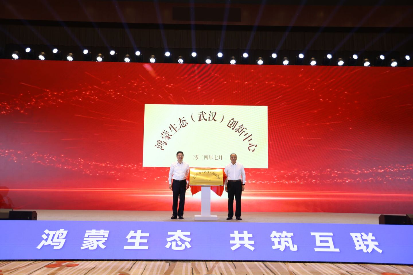 武漢市委副書記、市人民政府市長盛閱春(左)鴻蒙生態(tài)服務(wù)(深圳)有限公司總經(jīng)理杜金彪(右)共同為鴻蒙生態(tài)(武漢)創(chuàng)新中心揭牌