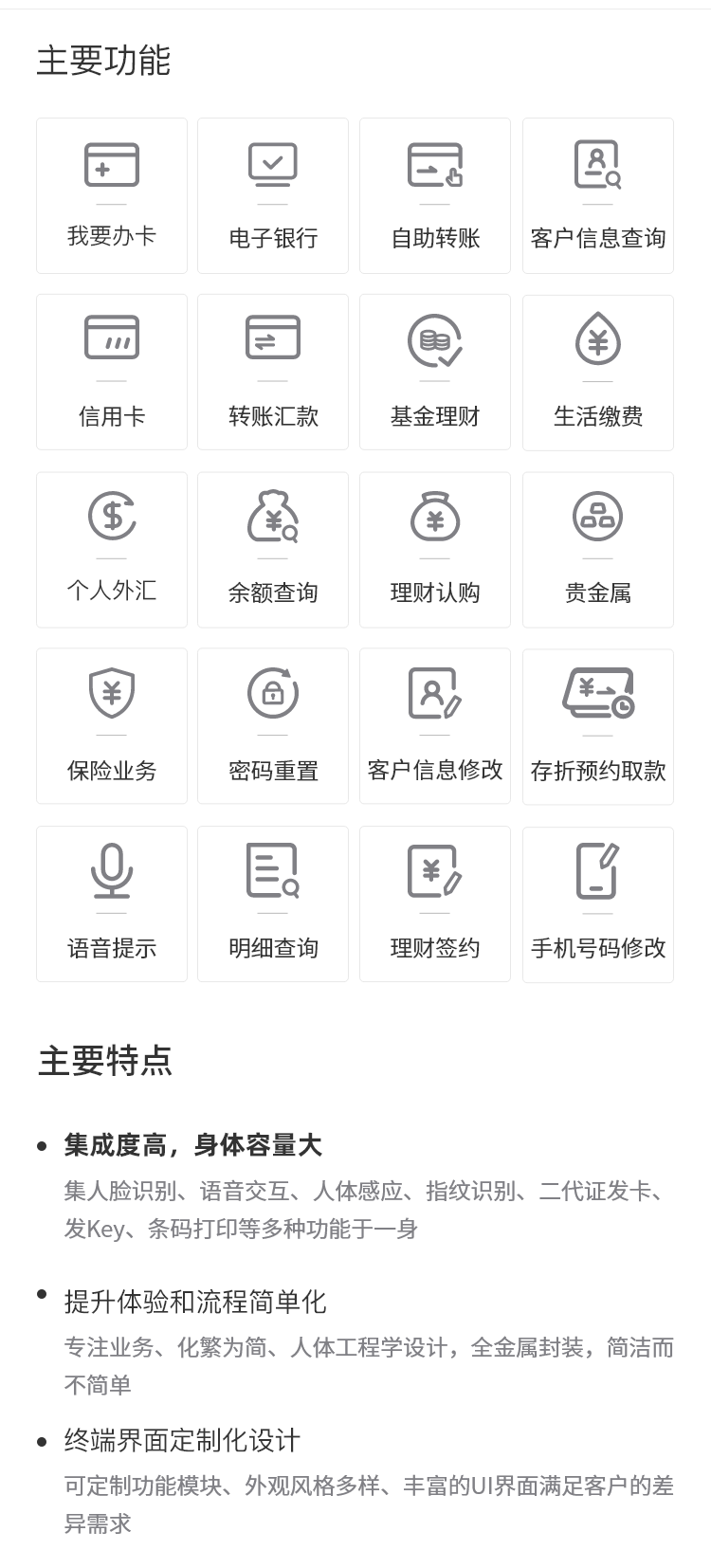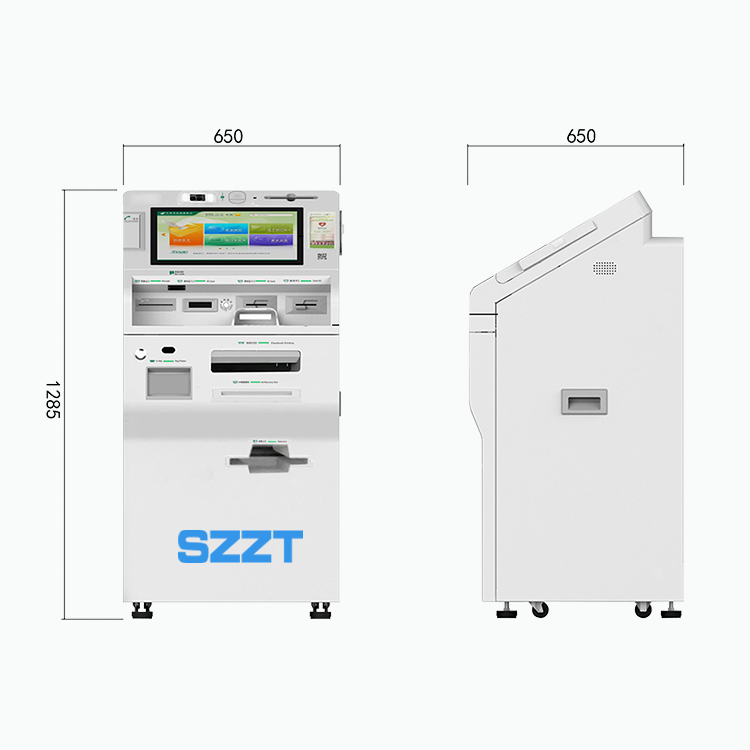 金融智能柜臺ZT2910-A03系列,19寸彩屏,極簡湊型設計,凸顯鈑金設備特有的商務感和價值感。整體外觀端莊大氣,色彩元素點綴,剛中帶柔,前開門式維護設計,集穩(wěn)重與快捷于一身??啥ㄖ苹δ苣K、外觀風格多樣、豐富的UI界面滿足客戶的差異化需求。